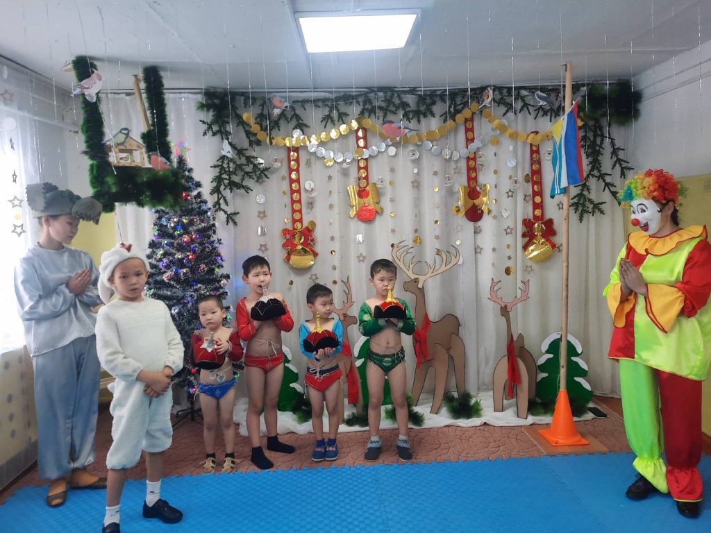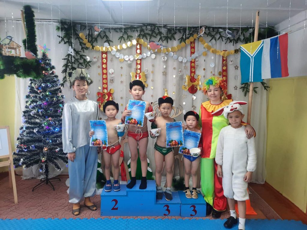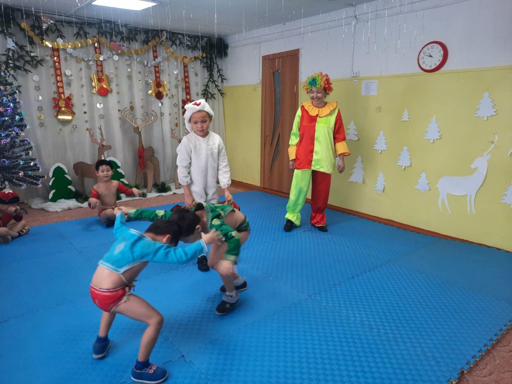 27 декабря 2022 года в рамках проекта «Хуреш в детские сады» в старшей группе проводилось новогоднее соревнование по национальной борьбе хуреш. Новогодний турнир проводили: судья соревнований маленький зайчик (моге салыкчызы) — прошлогодний наш воспитанник Монгуш Александрит, волк — помощница воспитателя старшей группы и клоун. Приняли участие 4 воспитанника. Состязались по круговой системе. Места распределились: