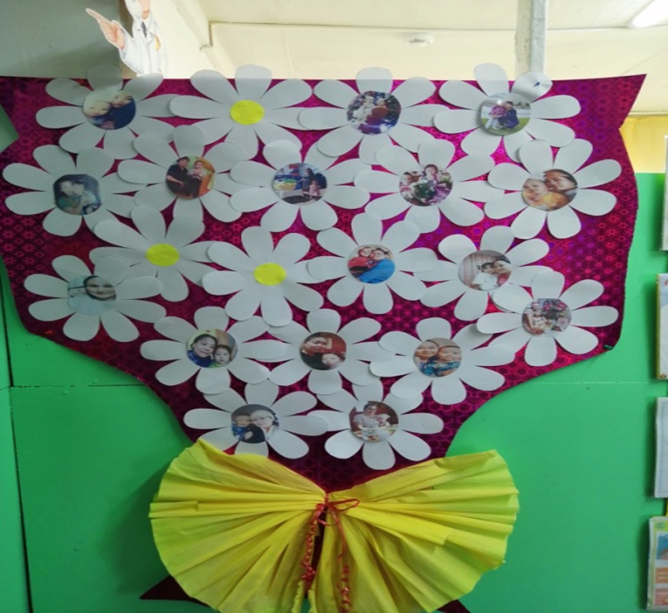 День матери у нас в стране отмечается в последнее ноябрьское воскресенье. В этот день, в отличие от 8 марта, поздравляют только матерей. И поэтому ко дню матери поздравили всех матерей воспитанников группы. Собрали из цветов большой букет с фотографиями матерей и сделали поздравительную стенгазету в приемной группы.